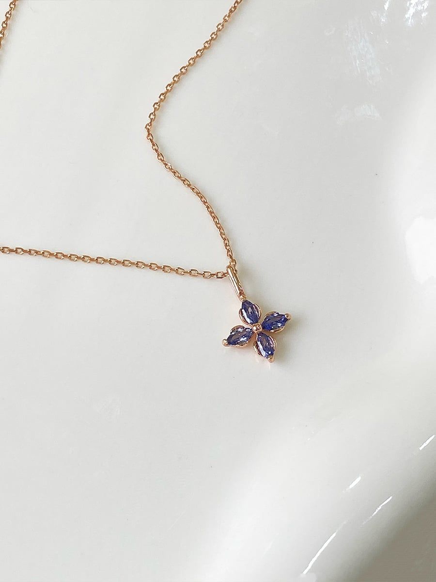 ✨ Điểm nhấn từ thiết kế tinh xảo: Mặt dây chuyền là hình ảnh bốn cánh hoa được chế tác từ những viên đá CZ tuyển chọn, với giác cắt Marquise độc đáo (kiểu cắt hình hạt thóc). Cách bố trí này giúp tối đa hóa khả năng bắt sáng, tạo nên một "hào quang" lấp lánh như những con sóng đang lăn tăn. Lớp hoàn thiện màu vàng hồng không chỉ tôn lên làn da Á Đông mà còn tạo nên một sự tương phản tuyệt vời với sắc đá xanh tím.